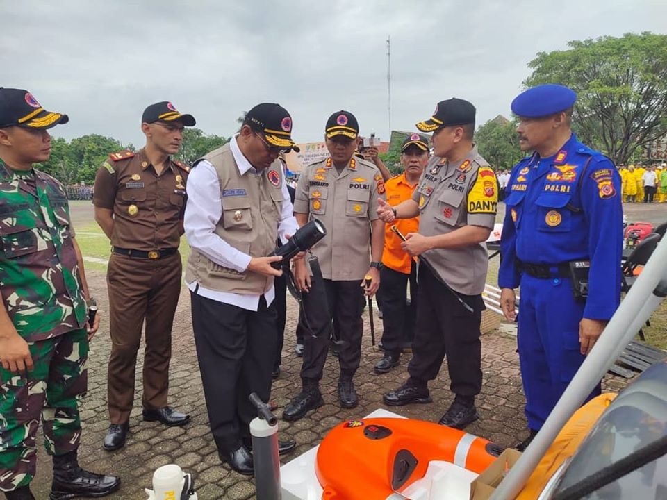 Plt Bupati Indramayu Taufik Hidayat saat memeriksa peralatan di acara Apel Pasukan Siaga Bencana di Alun- Alun Pendopo Indramayu, Rabu (15/1/2020).