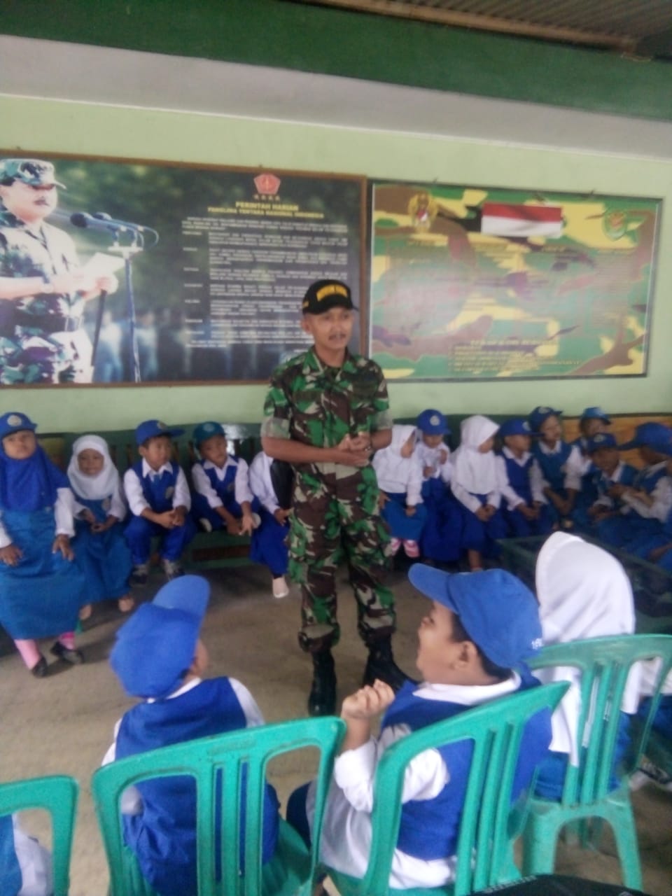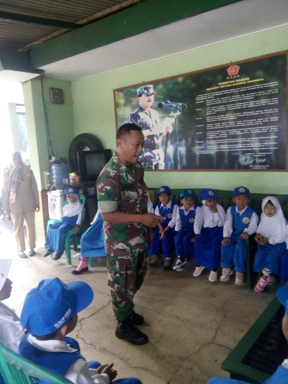 Para siswa TK An nur tampak antusias mendengarkan cerita dari anggota- anggota Koramil Haurgeulis tentang TNI. Ini terlihat saat Serka Maman bertanya kepada para siswa, “siapa yang ingin jadi TNI ?”